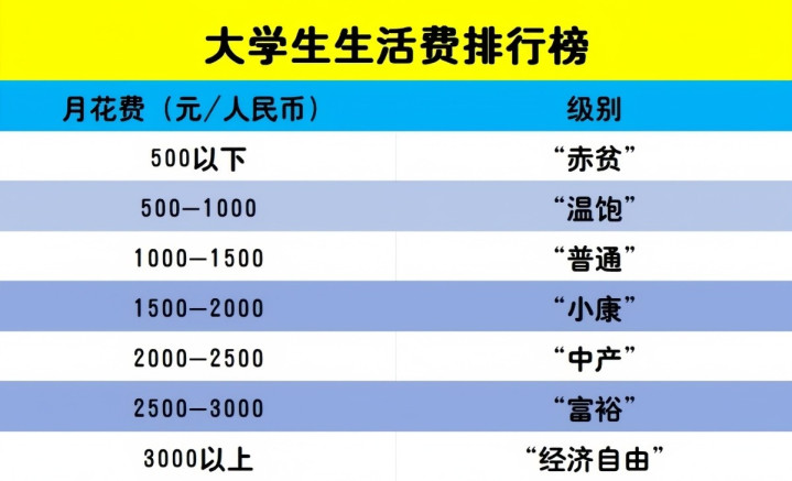 筹谋调研透露,刻下大学生月均生计费在1700元傍边,无数集结在1000到3500元之间。按照耗尽水平不错分红五个等第,浮浅家长参考。