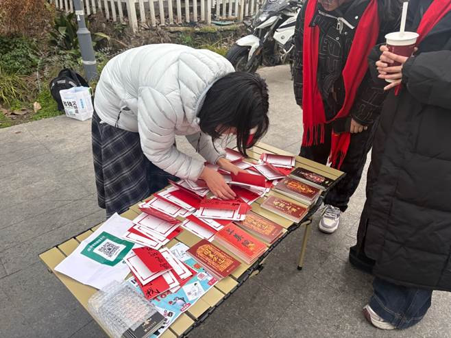 东说念主群中,还有个极端的摊位蛊惑了记者的眼神——毕业生桂同学在科场的对面,卖起了“助考”明信片:五元买一张送一张,附赠手写道贺。